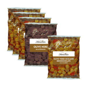 Selected black olives, pitted, in brine. Tasty and crunchy. Suggestions for use: for filling pizza, for the preparation of appetizers, aperitifs, savoury snacks, to finish salads and cold dishes or as an ingredient for the preparation of sauces, meats.