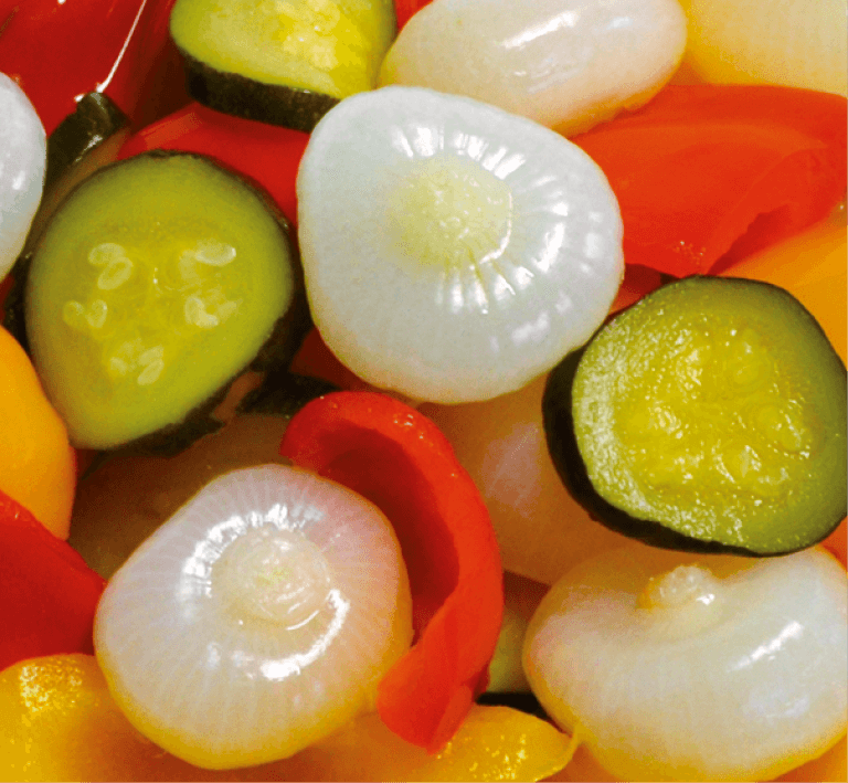 A balanced mixture of peppers, borettana onions and courgettes, roughly chopped (hence the name “rustic”) and preserved in sweet and sour liquid. Suggestions for use: excellent as an appetiser or side dish, cold, buffet or slightly heated. Ideal accompaniment for cold dishes, cold cuts or cheeses.